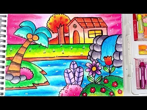 Contoh Gambar Pemandangan Air Terjun Dengan Crayon Inspiratif